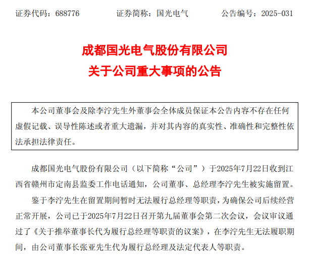 另一边,国光电气的高管变动同样引发猜测。7月22日晚间,国光电气发布公告称,收到江西省赣州市定南县监委工作电话通知,公司董事、总经理李泞被实施留置。