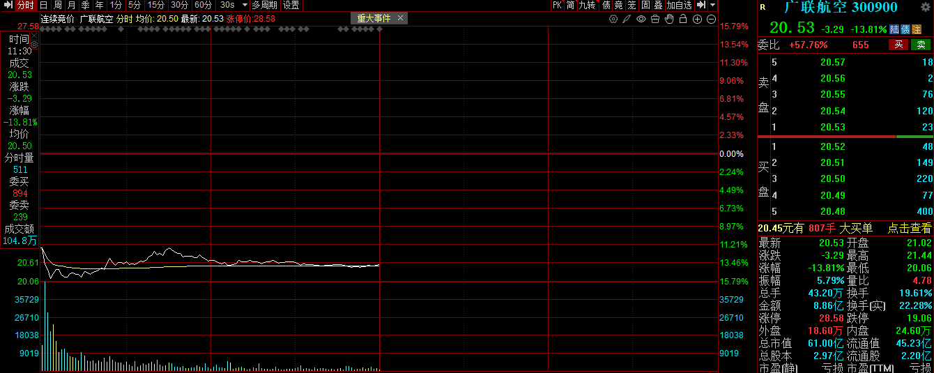 记者注意到,或受此事件影响,7月23日上午,广联航空股价开盘即跳水,截至午盘跌幅达13.81%,公司市值较上个交易日蒸发超9亿元。